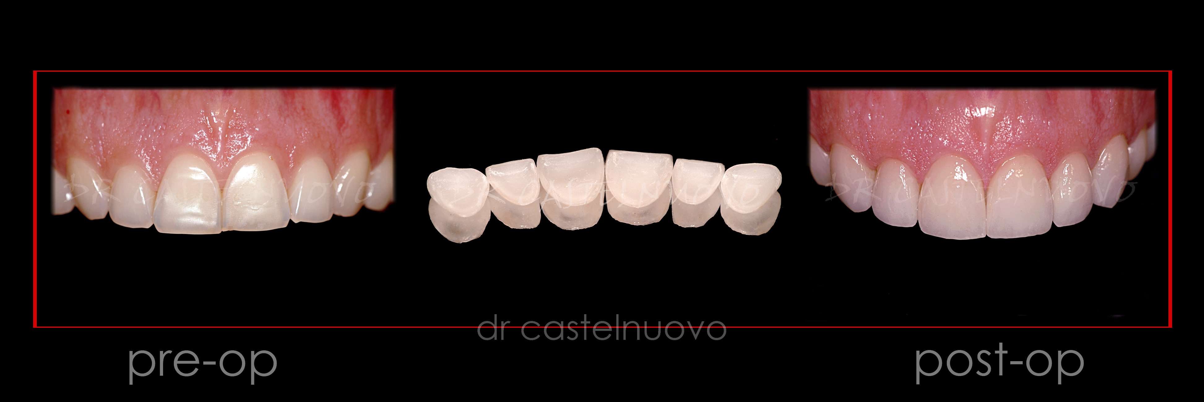 Veneers are very thin layers of porcelain (ceramic) bonded directly on the outer tooth surface. Because of the minimal thickness of such restoration (0.3-0.6mm), the tooth is prepared (reduced)very slightly, almost only roughened, the intention being to preserve the natural enamel underneath the bonded veneer. Porcelain veneers can be totally transparent or slightly coloured to cover dental discolorations. Porcelain veneers are mainly used to correct tooth anomalies in relation to form (shape), proportion (length, width), color.